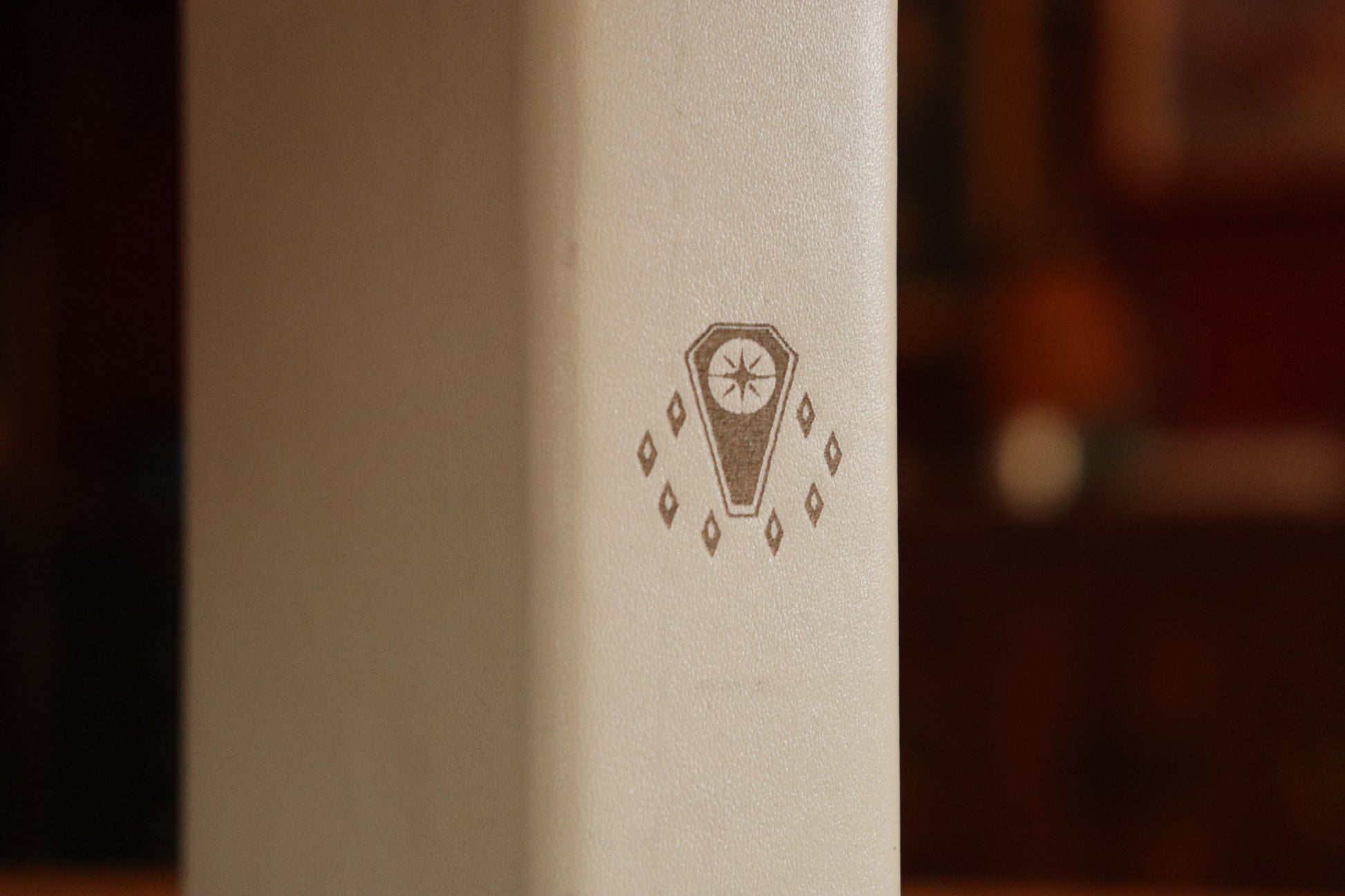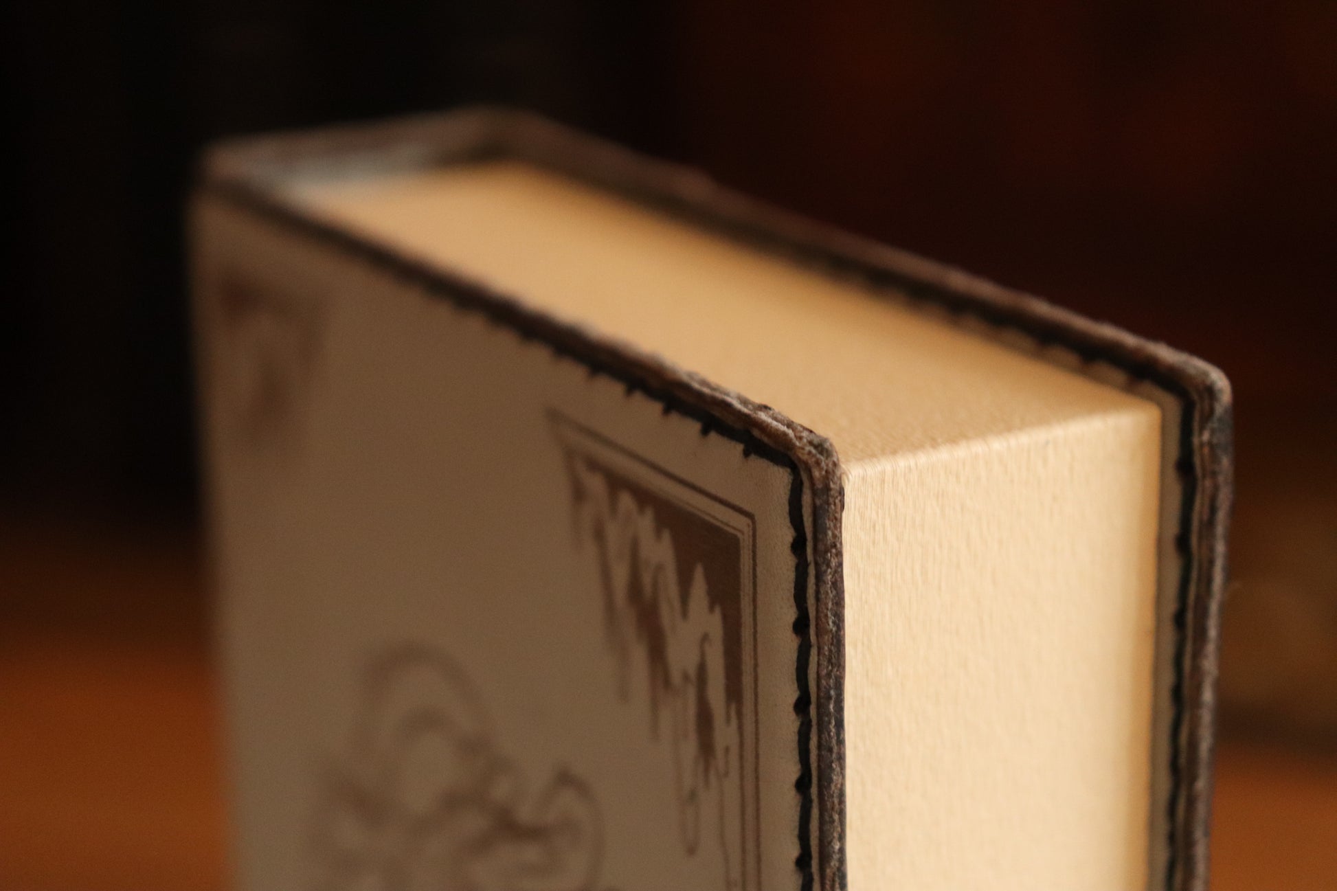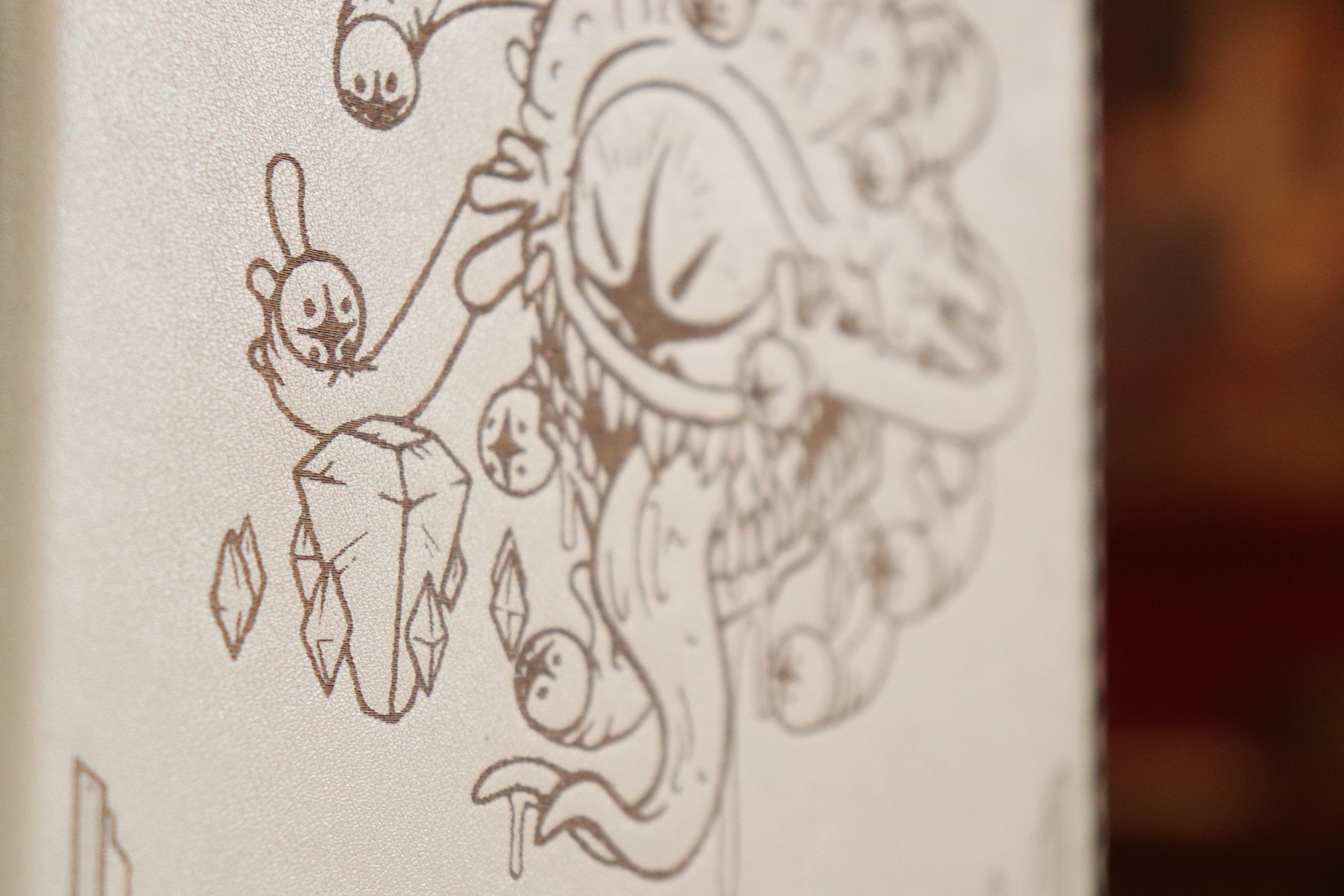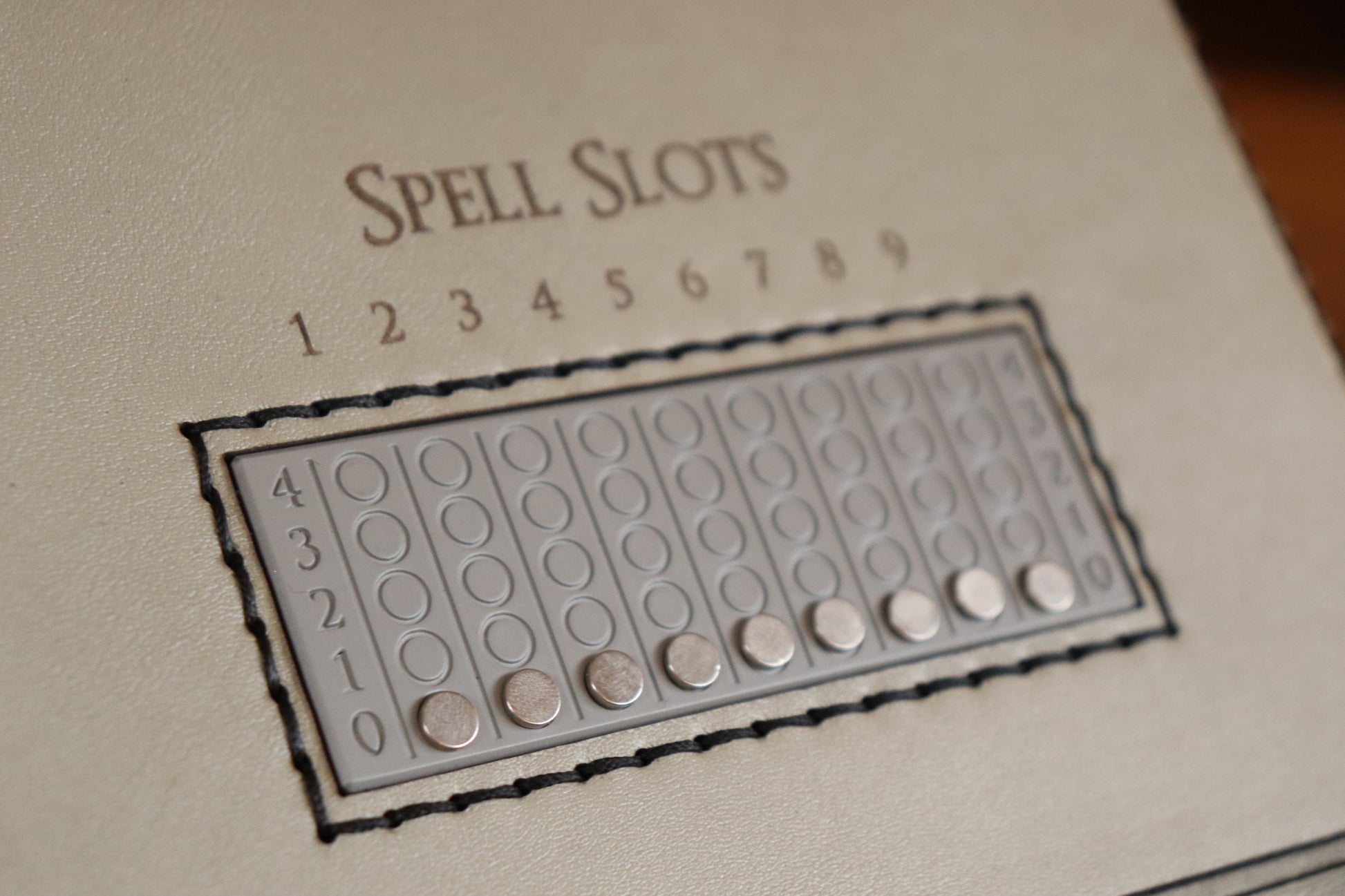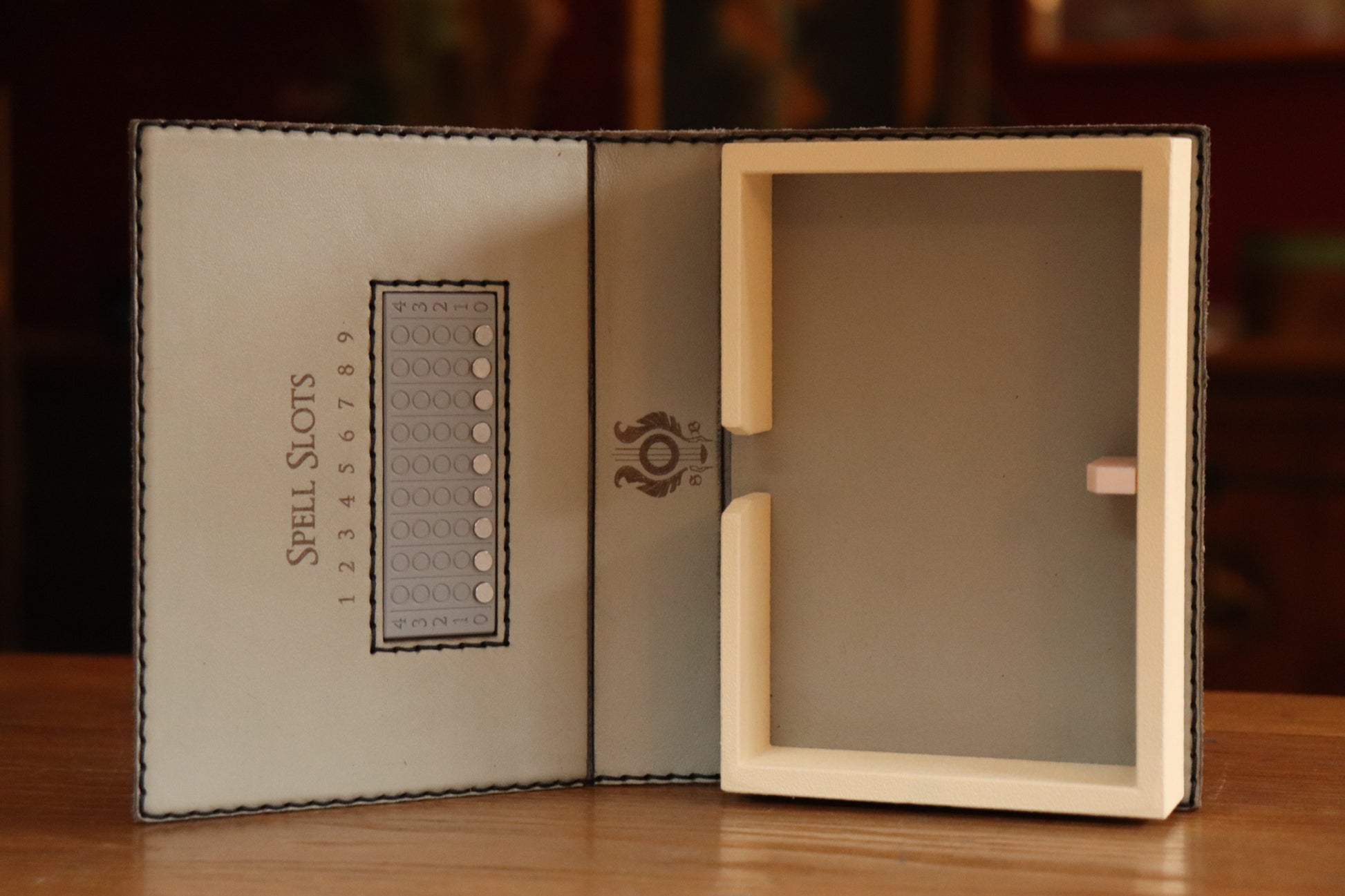 A Double-sized Caster Compendium (fits two 30mm stacks of playing cards, or ~5-6 sets of dice) made from grey leather and engraved with the Beholder engraving (design by XrisPhoenix). There is a magnetic Spell Slot Tracker embedded in the lid, and the Compendium can be used as a dice tray as well.