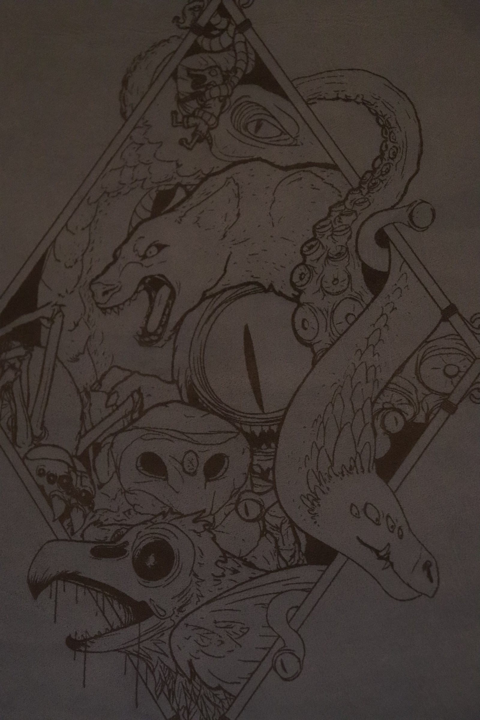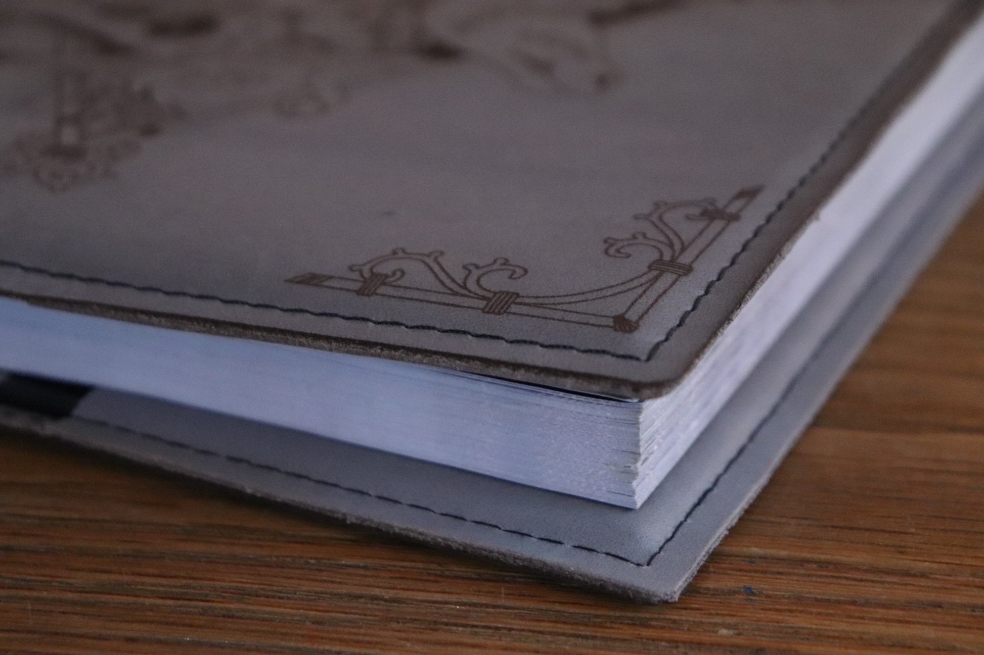 A grey leather book sleeve with black stitching featuring our Bestiary design engraved into the material, made to fit the D&D 5E (2014) Monster Manual. Book not included.