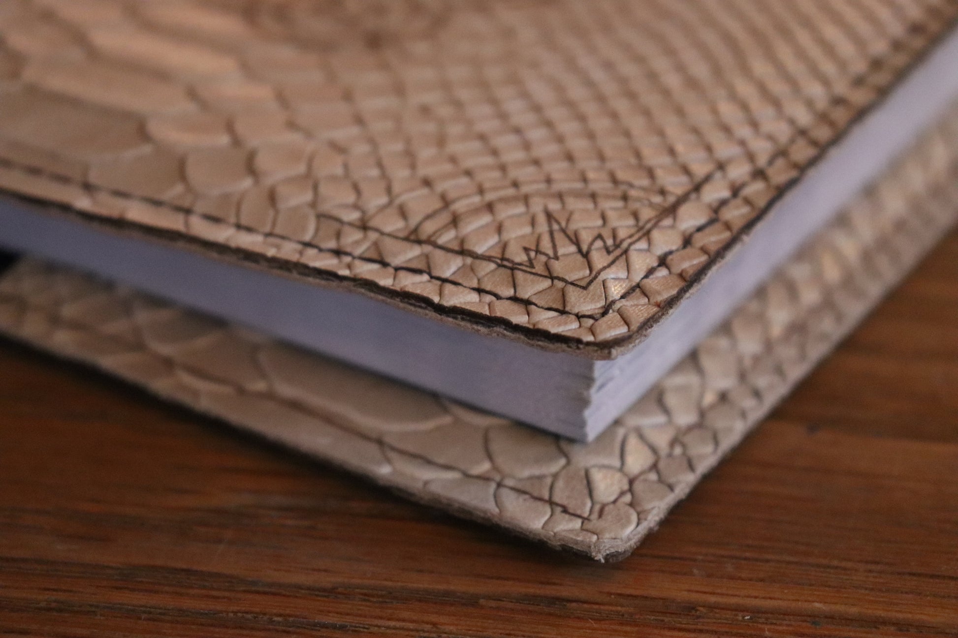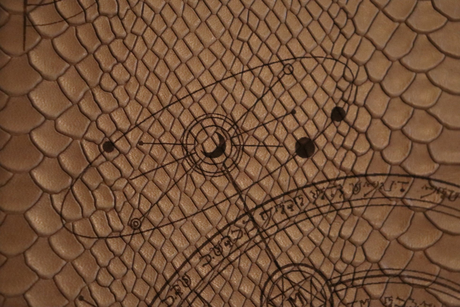 A white dragonscale leather book sleeve with brown stitching featuring our Conjurer design engraved into the material, made to fit the D&D 5E (2014) Player's Handbook. Book not included.