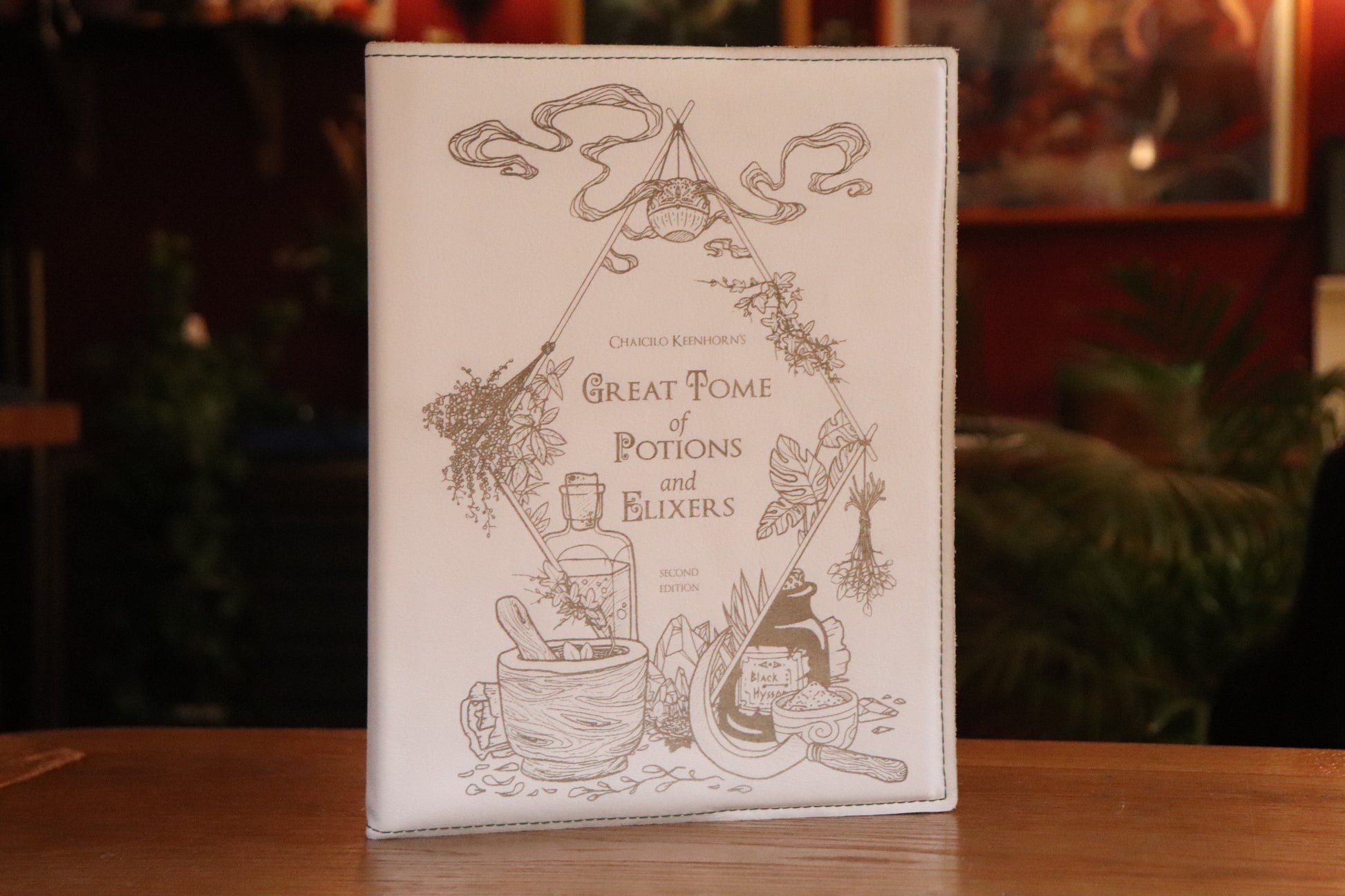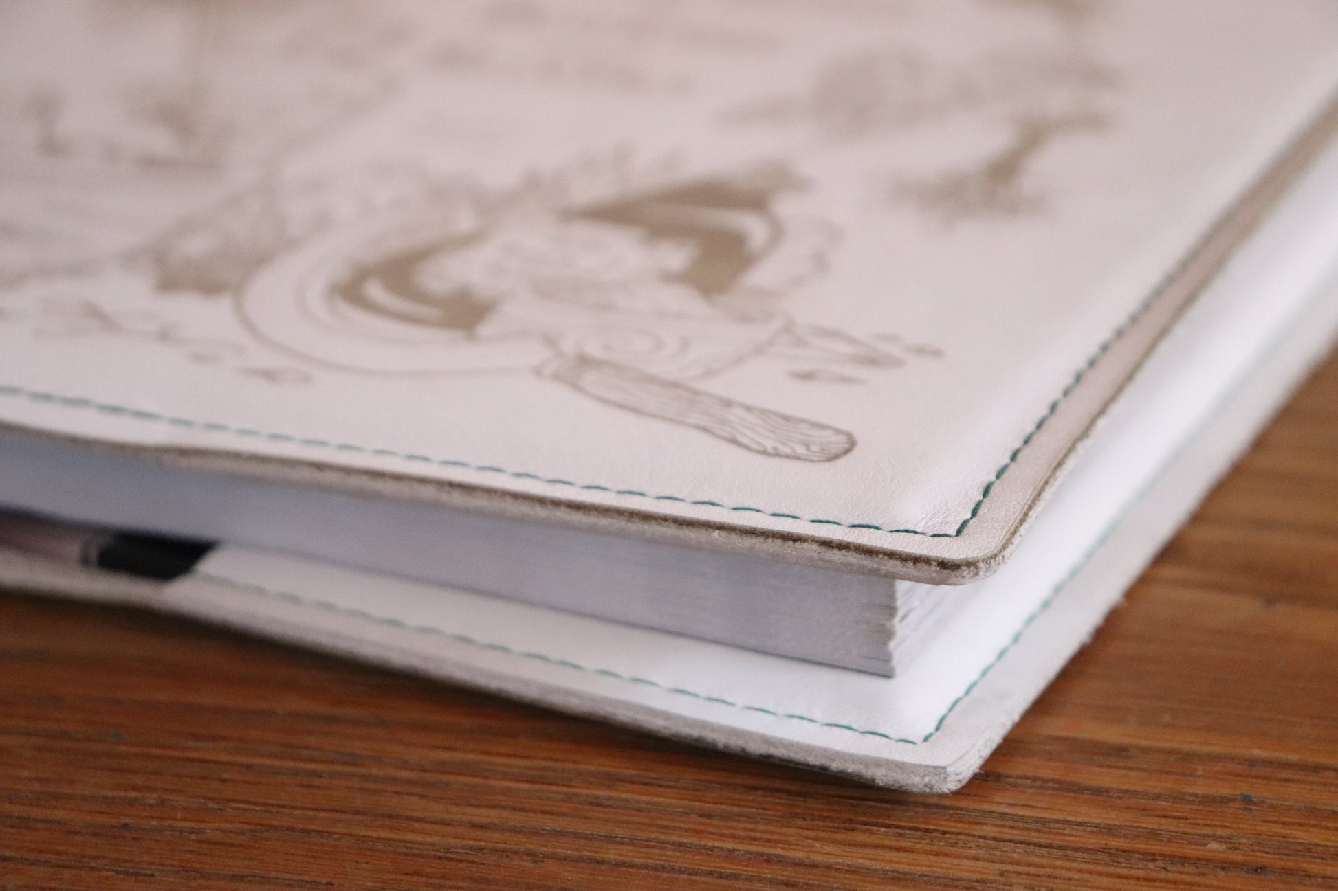 A white leather book sleeve with green stitching featuring our Herbalist design engraved into the material, made to fit the D&D 5E (2014) Player's Handbook. Book not included.