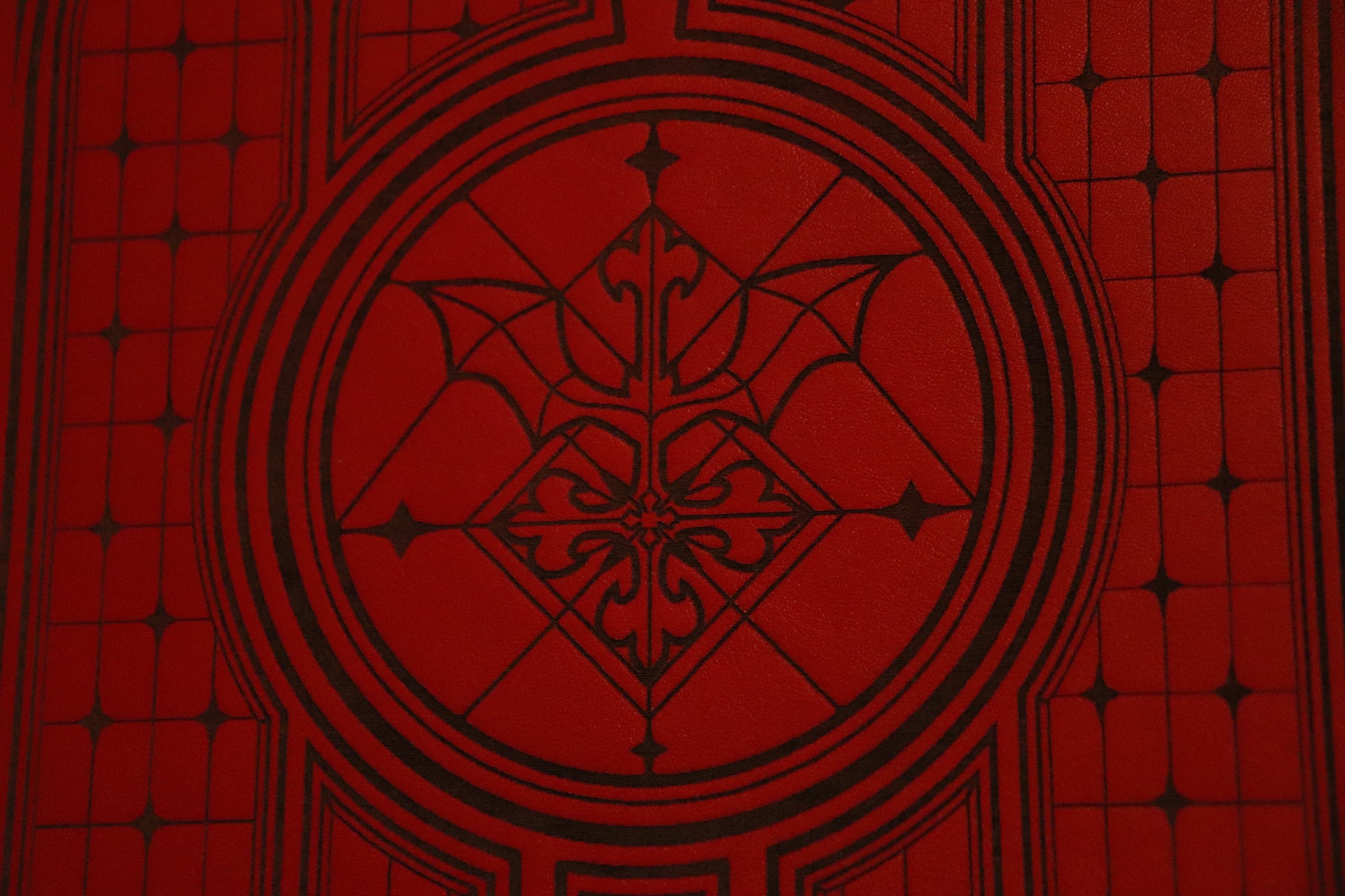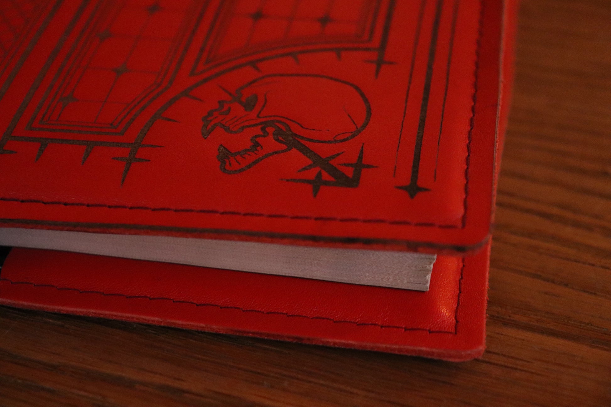 A red leather book sleeve with dark red stitching featuring our Undead King design engraved into the material, made to fit the D&D 5E (2014) Player's Handbook. Book not included.