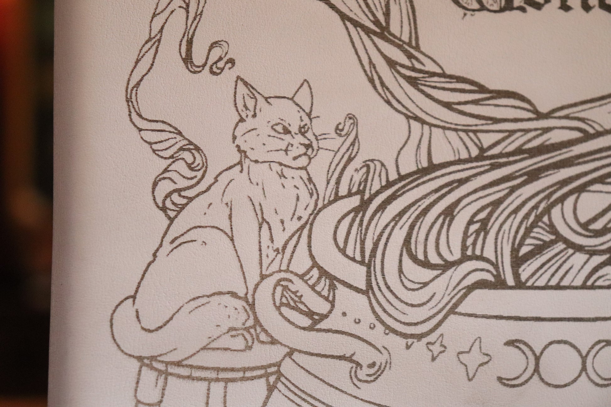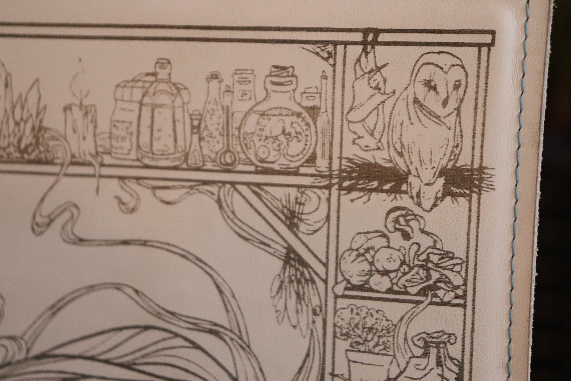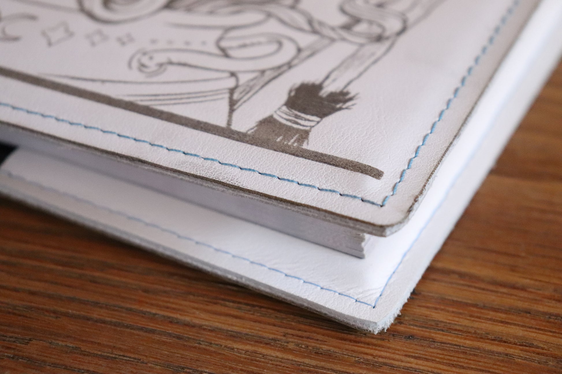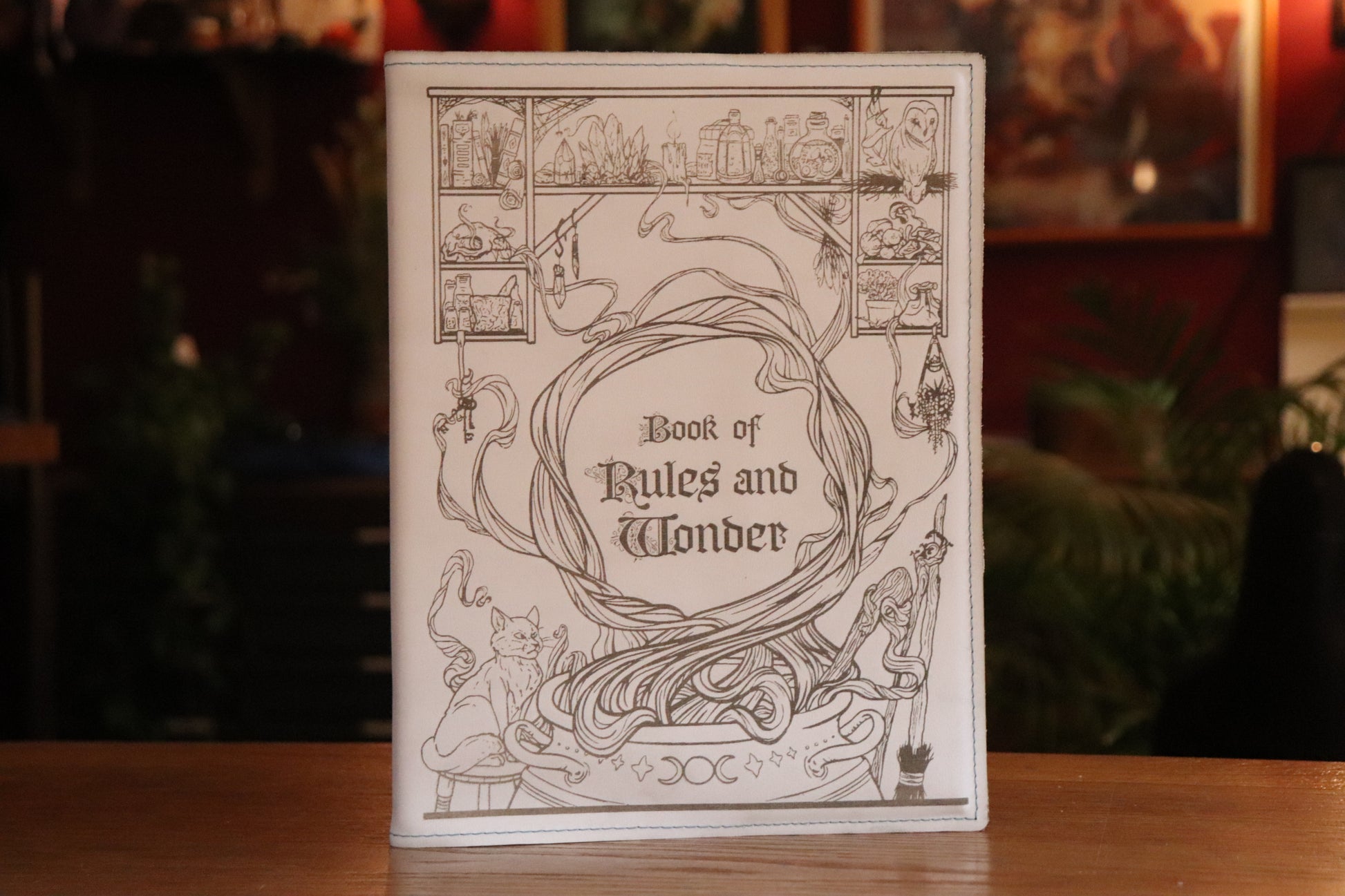 A white leather book sleeve with light blue stitching featuring our Witch design engraved into the material, made to fit the D&D 5E (2014) Player's Handbook. Book not included.