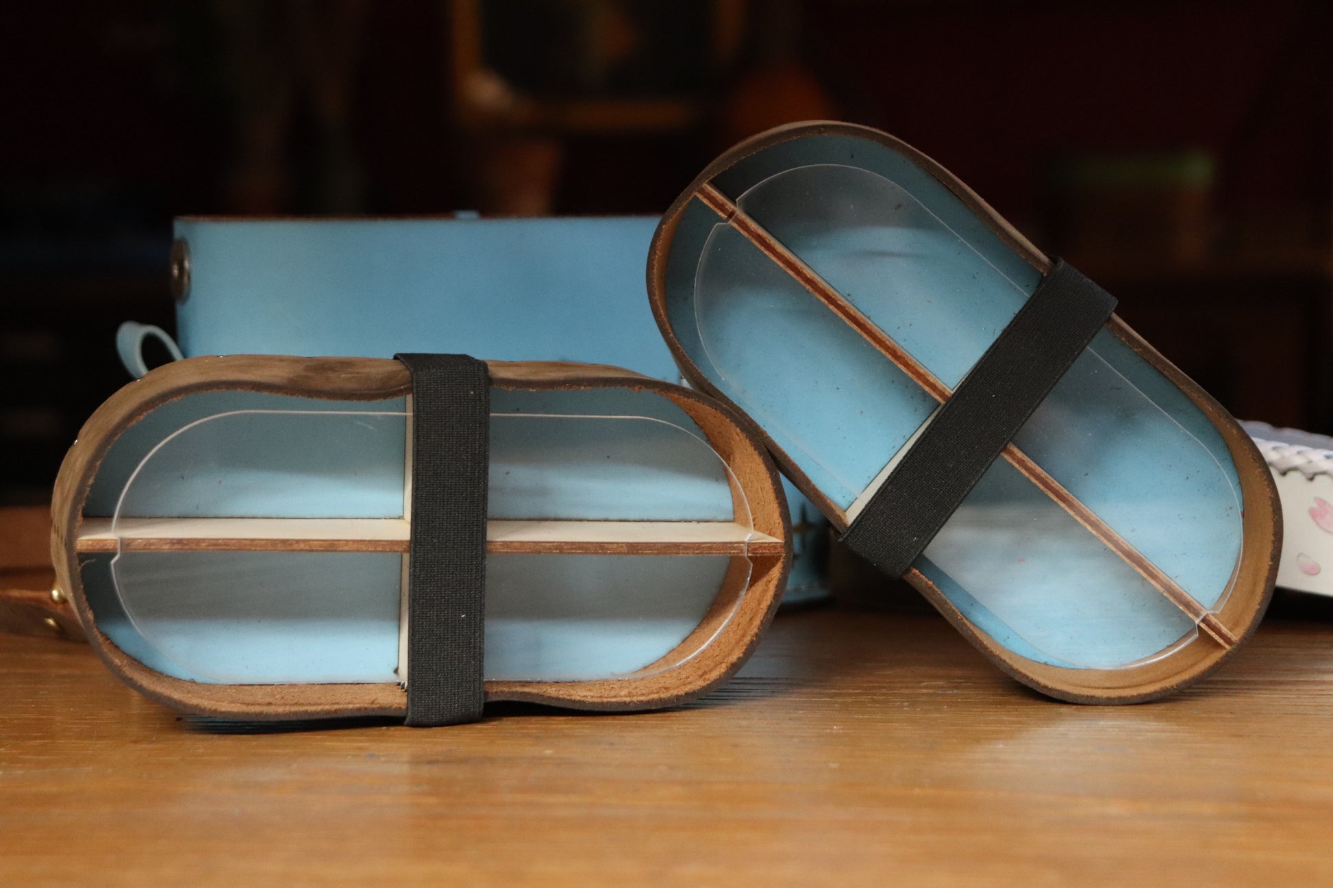 A leather shoulder bag with strap, extra thick lid (to double as dice tray) and up to two dice compartments. Each compartment fits up to eight complete sets of polyhedral dice.