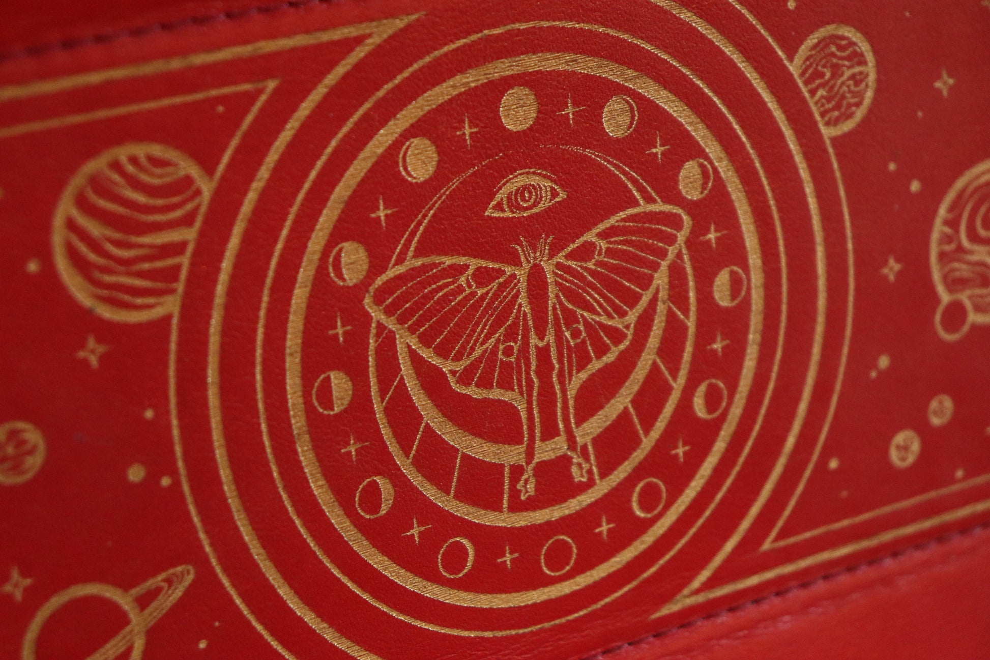 A triple layer leather dice tray engraved with our Luna Moth design. Top side is red leather with a gold-coloured wax inlay, bottom side is red leather, stitched together with dark red thread.