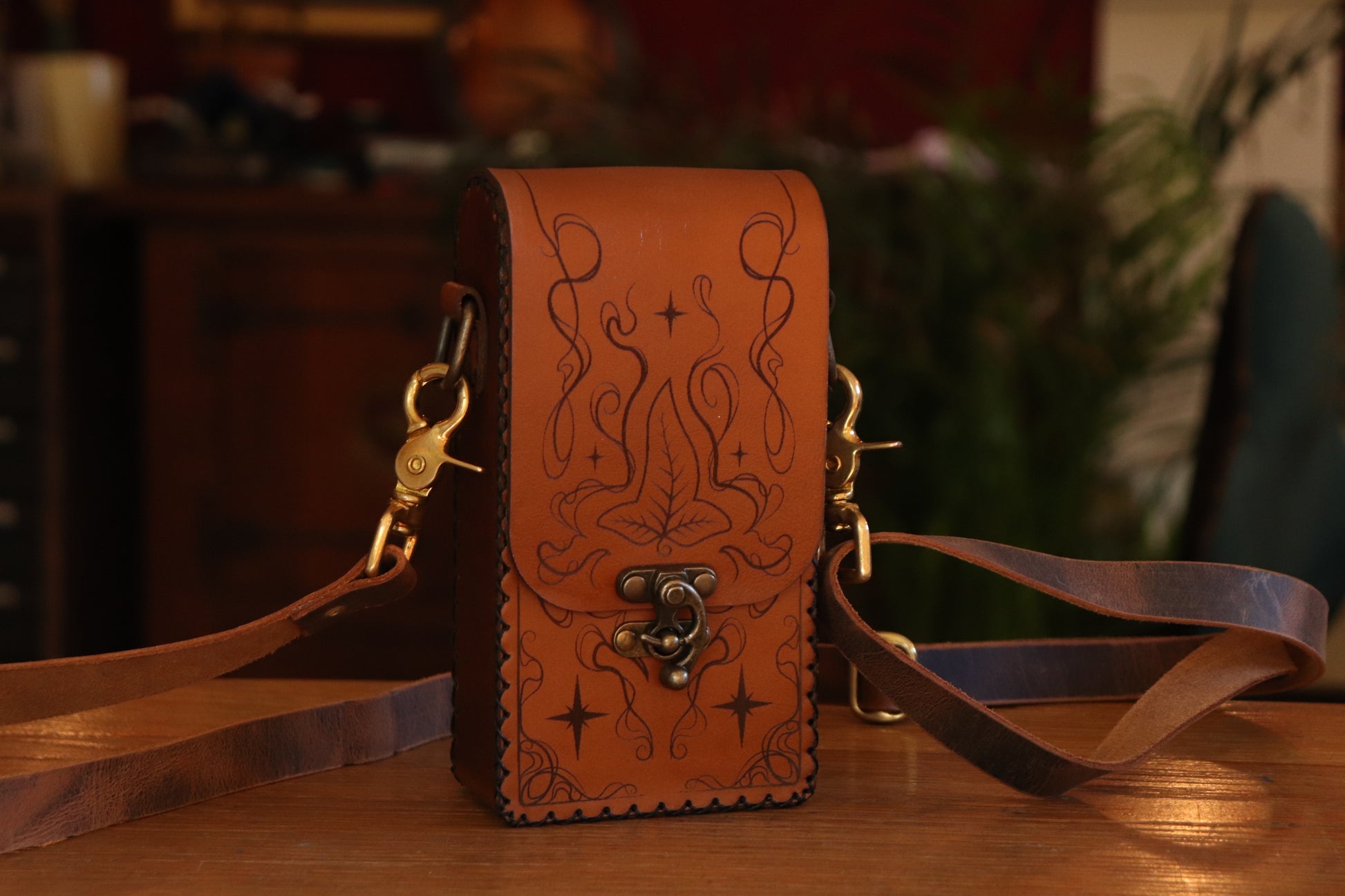 The Festival pouch is designed to hold a phone and a coin purse or card holder in a fantasy style that matches the vibes of ren faires and nerdy conventions. With a leather clad removable divider in the middle to protect your precious items from scratching.