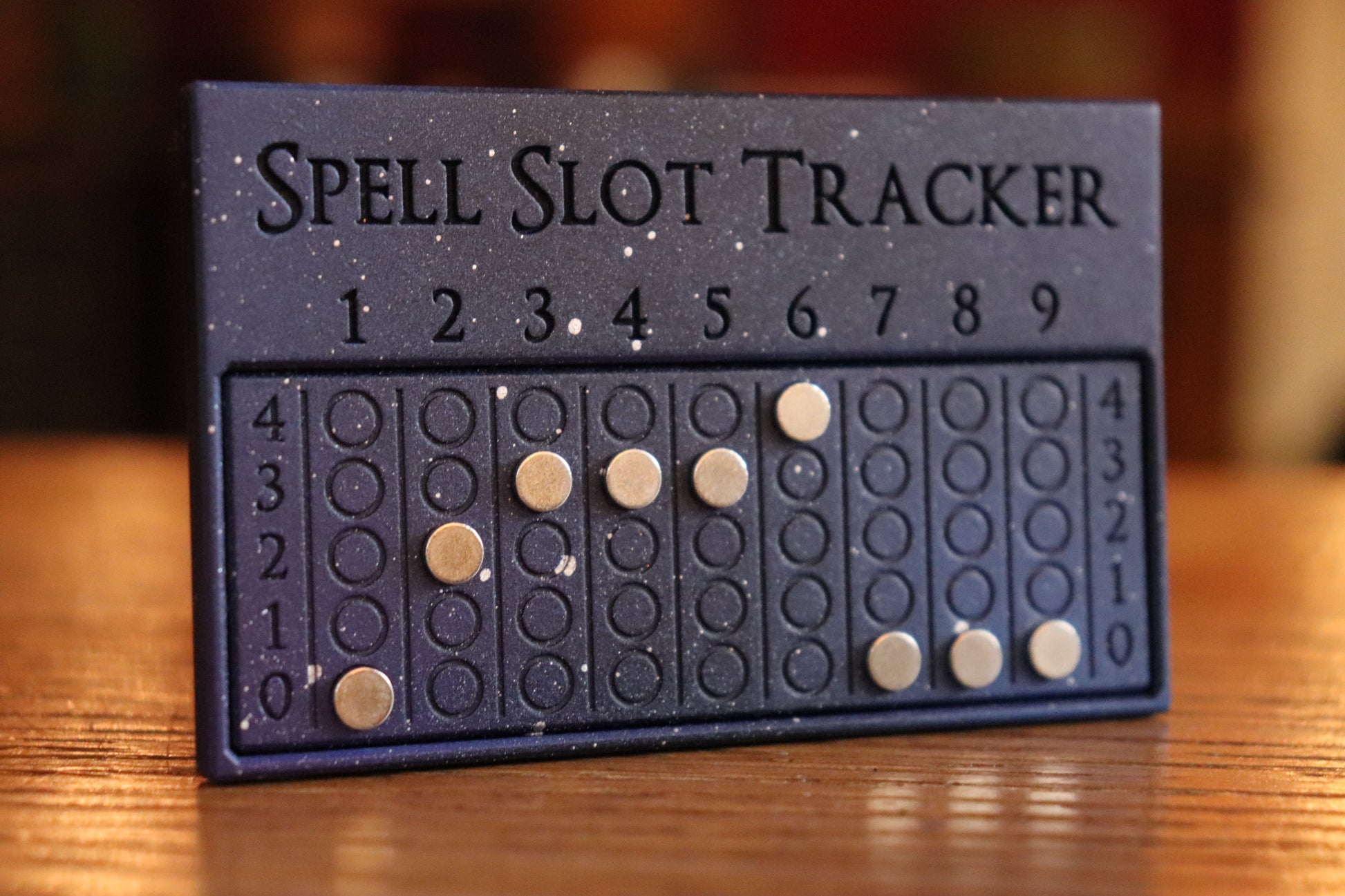A magnetic spell slot tracker, spray-painted in Galaxy colours. Comes with a leather sleeve to keep the magnets on it in between games.