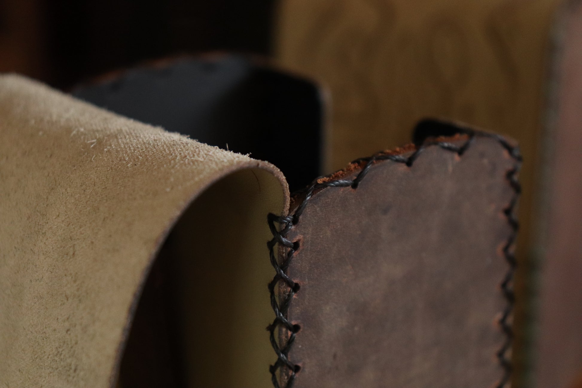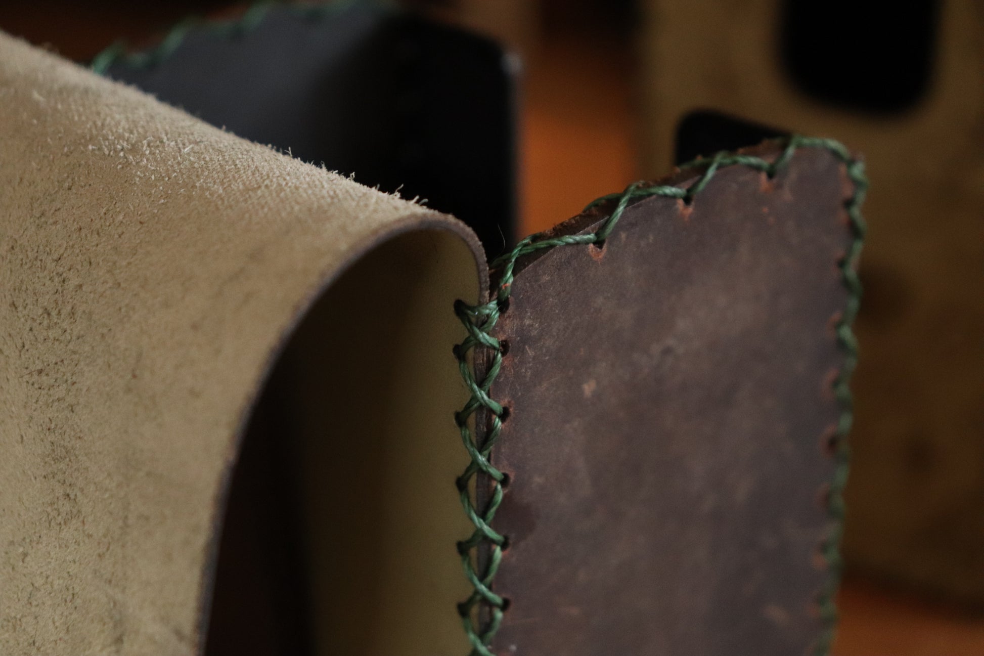 A green leather Tarot deck pouch with our Lórien design engraved into it, stitched with a green waxed thread. Made to fit a large deck (~50mm thick) with a bit of extra space on the sides for sleeves (width ~75mm, height ~125mm).