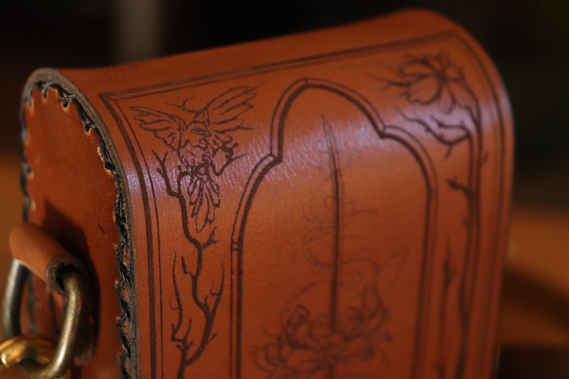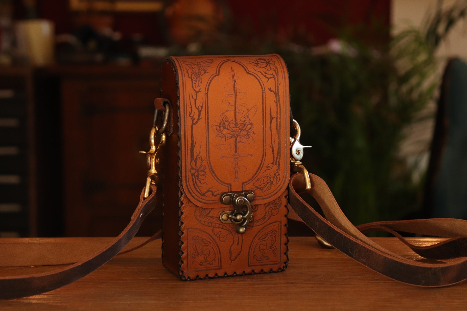 The Garden Witch is one of our more intricate designs, depicting birds, flowers, snakes and rabbits, with a stronger nudge towards Tarot with the sword in the flower crown. The sides and strap are made from a thicker waxed brown or black leather, which may show "scratching" easily (mainly the brown leather). While we are a fan of this as it shows life without being actually damaged, you can reduce the scratches by warming up the surface wax (for example with a hair dryer on the lowest setting) and buffing it, or adding wax when you wish to take care of your bag.